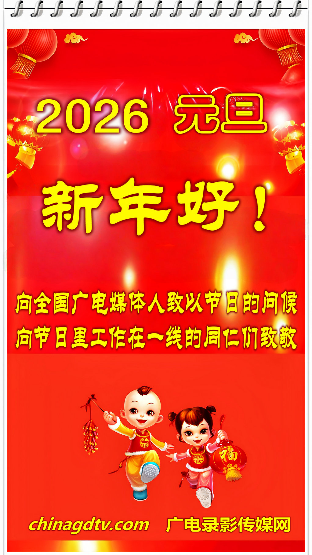 2026年元旦向全国媒体广电人祝贺节日 2026-01-01 行政办公室 ℃ 0 标签: 节日 上一篇:【2025春节】广电录影传媒网向全球华人恭贺新春 下一篇:没有了 相关推荐 China广电:2020国庆向全国媒体广电工作者恭祝节日 【2019春节 欢乐中国年】广电录影传媒网 新春祝 【2023春节】广电录影传媒网向全球华人恭贺新春 【2023春节 欢乐中国年】广电录影传媒网问候媒体 说点什么吧 全部评论(0) 最新 最早 还没有评论,快来抢沙发吧!